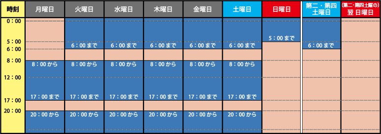 8:00~17:00(月~土) 20:00~翌6:00(月~金) 20:00~翌5:00(土)